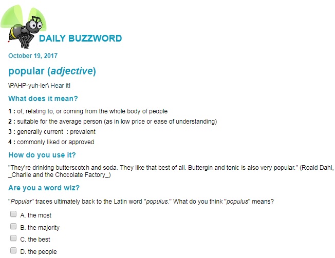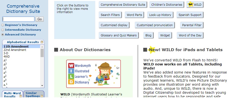 Đây là một trang từ điển đầy đủ các tính năng với những mục như phát âm, hình ảnh, từ đồng nghĩa, nghĩa gốc của từ. Trẻ có thể lựa chọn tìm kiếm ở 3 cấp độ khác nhau: người mới bắt đầu (sơ cấp), trẻ em và trình độ cao cấp.