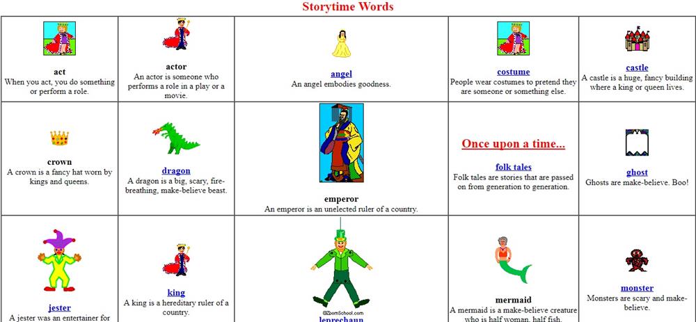 Những từ trong chủ đề "Storytime" được giới thiệu trên trang (Ảnh: Little Explorers).