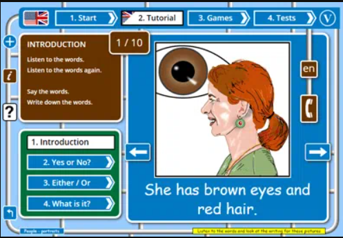 Các từ vựng được sắp xếp theo chủ đề. Chọn một chủ đề, bạn sẽ nhìn thấy các hình ảnh minh hoạ. Di chuột qua từng hình sẽ nghe thấy tiếng, nhìn thấy từ. Nhấn vào hình bánh xe ở góc trên bên phải màn hình để chọn mức độ học dễ hay khó. Luyện tập bằng cách làm Listening Challenge, Speaking Challenge.