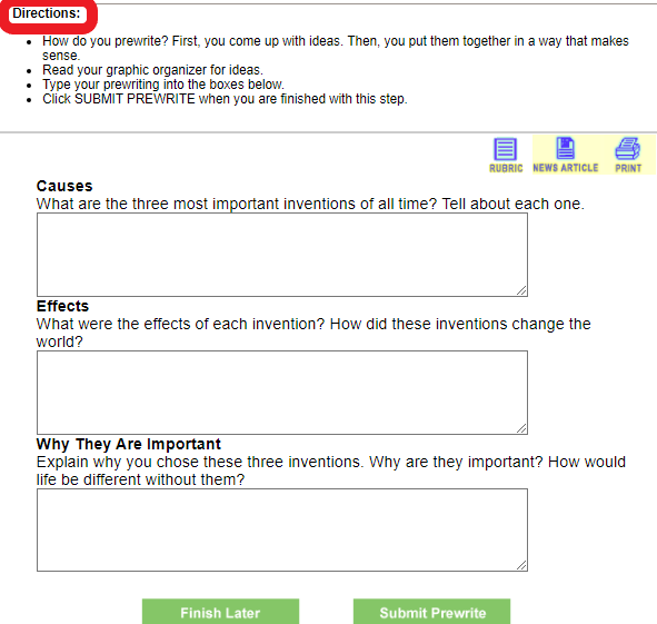 Trong phần Prewrite, hệ thống sẽ đưa ra hướng dẫn chi tiết - Directions. Đầu tiên, các em sẽ hình thành các ý chính cho bài viết, có thể dựa vào graphic organizer đã hoàn thành từ bước trước để sắp xếp ý tưởng. Sau đó, viết các ý tương ứng với các yêu cầu cụ thể của bài viết trong các khung soạn thảo bên dưới. Chọn Finish later để hoàn thành sau hoặc Submit Prewrite để nộp ngay.