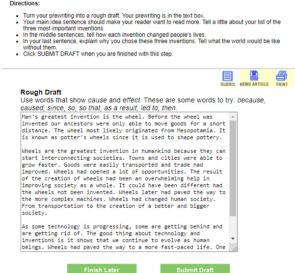 Tương tự bước Prewrite, ở bước Draft, hệ thống cũng đưa ra chỉ dẫn để các em soát lại bài viết của mình, từ câu mở bài, các câu thân bài, tới câu kết luận xem đã nêu đúng và đủ ý chưa. Nếu đã ổn, các em chọn Submit Draft để nộp bài viết hoặc chọn Finish Later để chỉnh sửa tiếp và nộp sau.