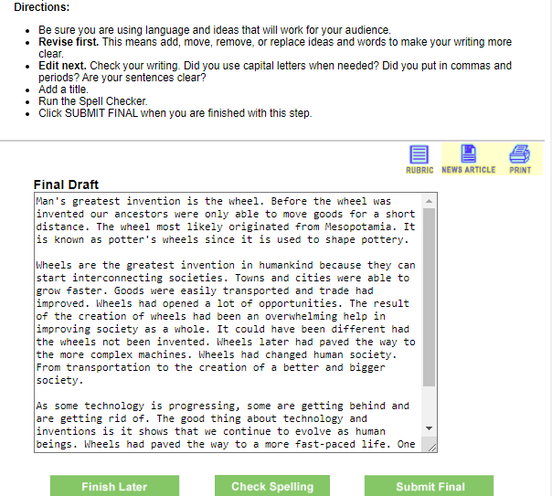 Ở bước cuối cùng Revise/Edit, các em cần kiểm tra lỗi chính tả - có thể bấm chọn Check Spelling để hệ thống tự động kiểm tra lỗi chính tả trong bài viết. Ngoài ra, có thể thêm, bớt, sửa những câu, từ chưa ưng ý và nhớ đặt tiêu đề cho bài viết. Chọn Submit Final để nộp bài viết hoặc chọn Finish Later để chỉnh sửa tiếp và nộp sau.