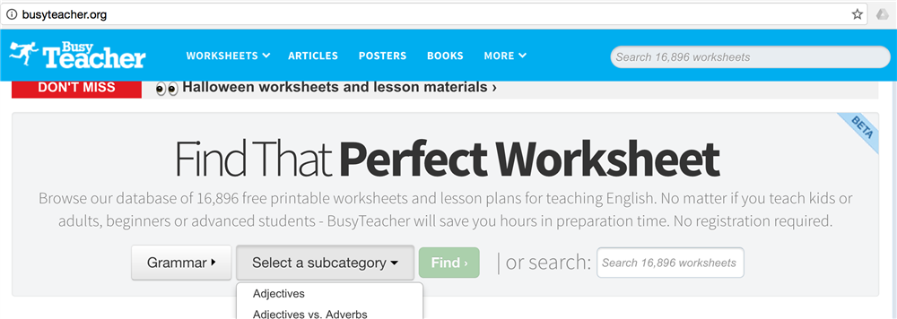 Cách 1: Vào trang chủ http://busyteacher.org, trên vùng Find That Perfect Worksheet, chọn tìm theo Category, rồi chọn tiếp Subcategory hoặc filter để ra loại worksheet bạn đang cần: