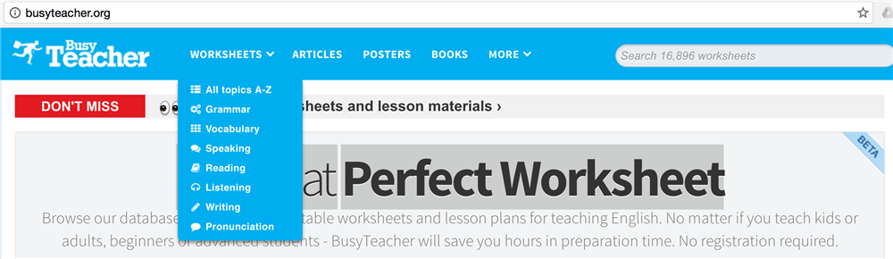 busyteacher.org cung cấp khoảng 17.000 worksheet được chia sẻ bởi và cho các teacher hoặc homeschooler, được phân loại rõ ràng. Rất phù hợp cho các mẹ và các con muốn tìm bài tập bổ trợ khi đang học chủ đề tiếng Anh cụ thể nào đó.