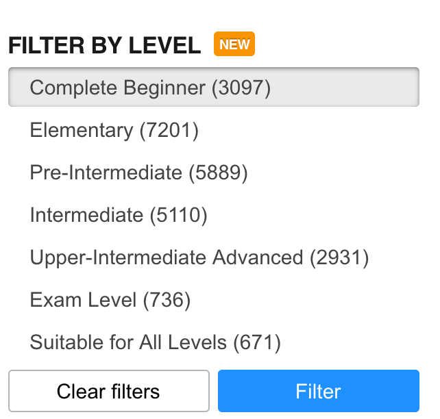 Cách 2: vào menu worksheets, chọn category bạn muốn, rồi filer tiếp theo level, như ví dụ khi tôi chọn Vocabulary thế nào: