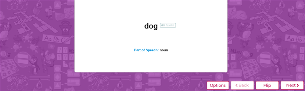 - Chắc hẳn các bạn nhỏ không còn xa lạ với hoạt động học từ mới bằng flashcard nữa. Ở đây, thông tin đầy đủ và cơ bản liên quan tới từ mới được thể hiện ở 2 mặt thẻ. Theo mặc định, mặt trước thẻ có từ mới và từ loại (part of speech) của từ đó (danh từ/động từ/tính từ...). Bé bấm vào biểu tượng loa để nghe hệ thống đánh vần từ mới.
