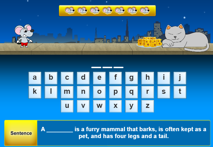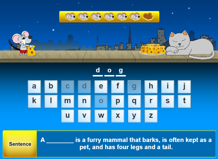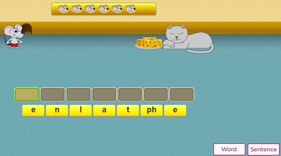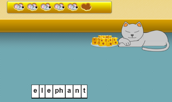 - Nhiệm vụ của bé trong trò chơi này là giúp bạn chuột lấy những miếng phô mai vốn được mèo canh giữ bằng cách chọn trong nhóm cho trước lần lượt từng chữ cái đúng để tạo thành từ. Mỗi chữ được chọn sau đó sẽ mờ đi. Mỗi lần chọn đúng, bé giúp chuột lấy được một miếng phô mai.