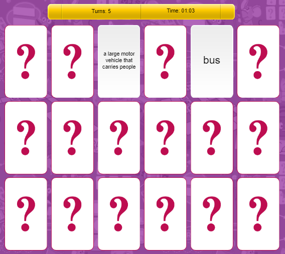 Trò chơi này giúp kiểm tra khả năng học và ghi nhớ từ mới của bé ở mức độ khó hơn. Bởi nếu Sound it out chủ yếu tập trung vào khả năng nhận biết các âm tạo nên từ hay Word unscramble tập trung vào khả năng nhận biết các chữ cái tạo nên từ thì Memory match buộc bé phải nhận biết và ghi nhớ từ, định nghĩa của từ, từ đồng nghĩa/trái nghĩa...