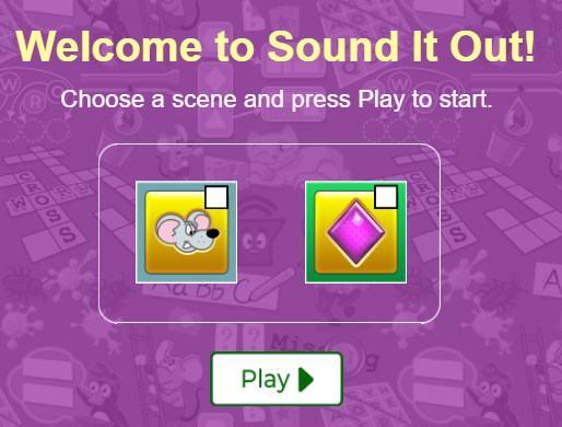 - Trước khi bắt đầu, bé sẽ chọn 1 bối cảnh (scene) - nơi diễn ra trò chơi bằng cách tick vào ô hình chuột hoặc ô hình kim cương rồi nhấn Play.