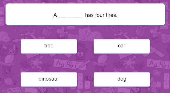 - Trò chơi được thiết kế như câu hỏi trắc nghiệm. Từ định nghĩa về từ, bé sẽ phải chọn 1 từ đúng trong số 4 đáp án được đưa ra.