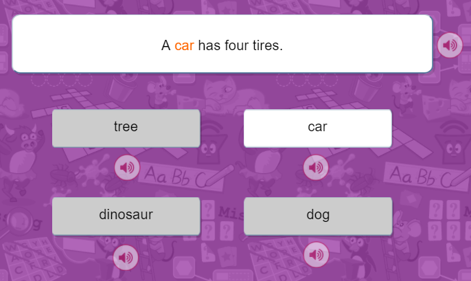 - Nhiệm vụ của bé là chọn 1 trong 4 đáp án có sẵn từ chính xác để điền vào ô trống.