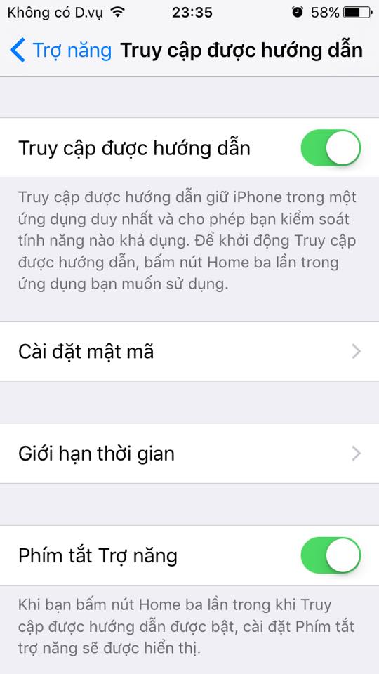 - Bật chức năng "truy cập được hướng dẫn" trong mục Cài đặt/ Cài đặt chung / Trợ năng,