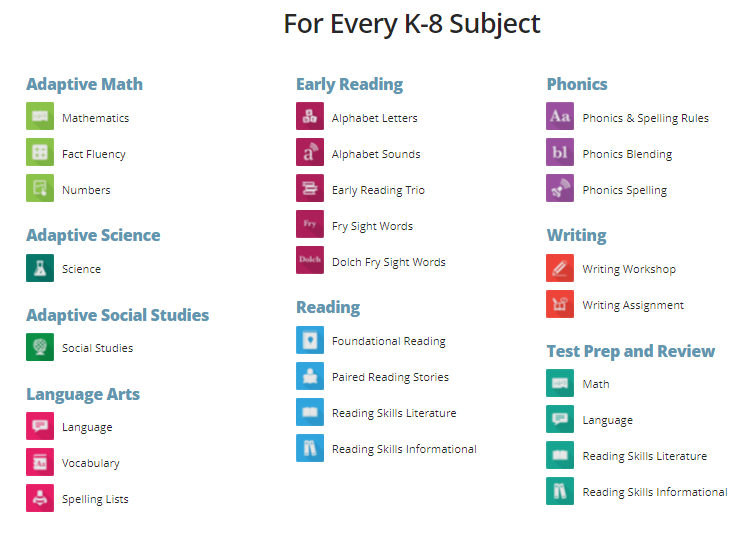 Với MobyMax, trẻ từ mầm non tới hết lớp 8 sẽ được học các môn kèm các phân môn cụ thể như sau: