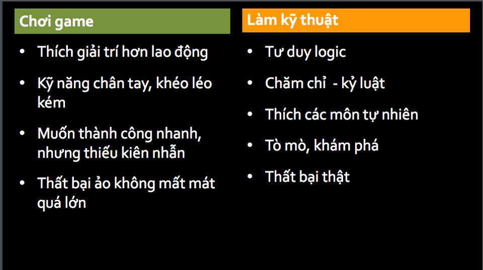 Phần lớn những trò game cho trẻ đều mang tính thuần giải trí. Trong khi lập trình đòi hỏi phải có tư duy logic. Trẻ chơi game thường ít vận động, chỉ muốn thành công nhanh, hay sốt ruột, hay nản, thiếu kiên trì, không dám đối mặt với thất bại. Còn trẻ có ham thích lập trình thường ham thích các môn tự nhiên, chăm chỉ, có kỷ luật, thích khám phá.