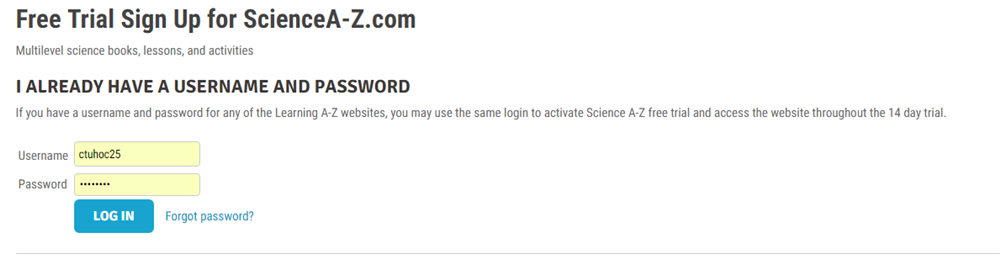 Nếu bạn đang sử dụng riêng một licence Raz-Plus, bạn kích hoạt Science A-Z để sử dụng thử: