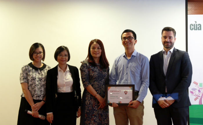 Ông Hoàng Thanh Bình - giám đốc Công ty Cổ phần Giáo dục Con Tự Học (thứ 2 từ phải sang) đón nhận giấy chứng nhận hợp tác từ đại diện Learning A-Z.