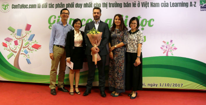 Ông Kostas Pexos chuyên gia tư vấn của Learning A-Z chụp ảnh lưu niệm cùng Ban lãnh đạo ConTuHoc.com và Ban lãnh đạo iGroup Asia Pacific