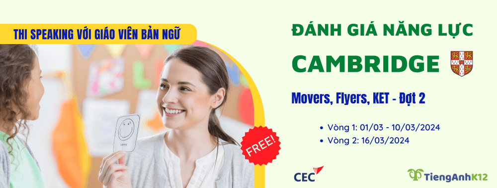 Nhằm giúp các em học sinh đánh giá trình độ tiếng Anh theo khung đánh giá tiếng Anh chuẩn Quốc tế cũng như làm quen với kỳ thi Cambridge, TiengAnhK12 phối hợp với CEC - Hội đồng Anh ngữ Canada - tổ chức kỳ thi thử Cambrige Movers, Flyers, KET miễn phí, đánh giá 04 kỹ năng Nghe, Nói, Đọc, Viết.