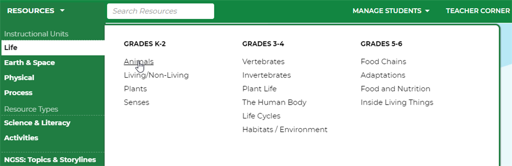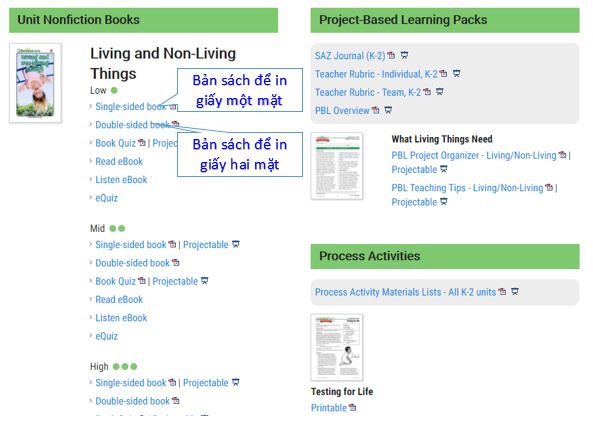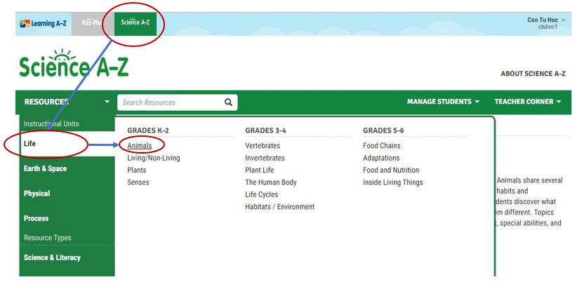 Sau khi đăng nhập tài khoản teacher, bạn click vào tab Science A-Z trên đầu trang, rồi vào Resources, chọn bài học tương ứng: