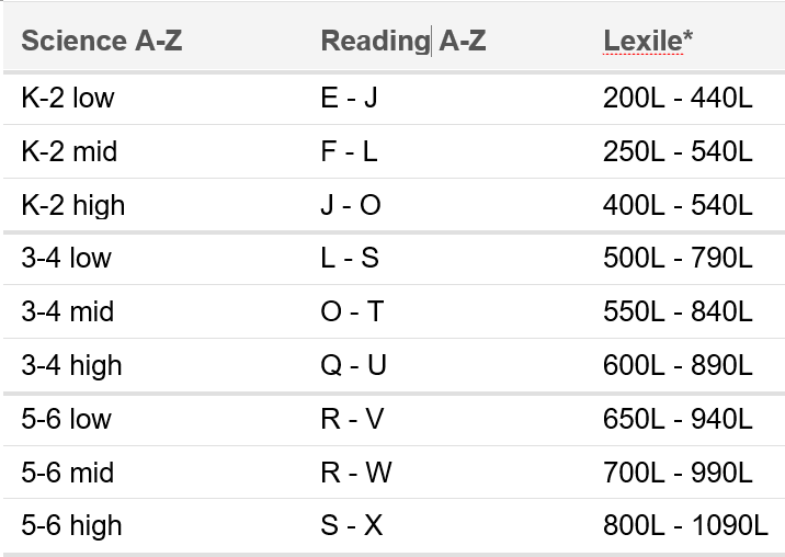 Để xác định level nào phù hợp với trẻ khi học Science A-Z, bạn hãy sử dụng bảng đối chiếu dưới đây:
