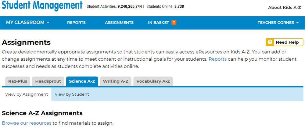 - Ở mục ASSIGNMENTS, chọn thẻ Science A-Z, bấm Browse our resources.