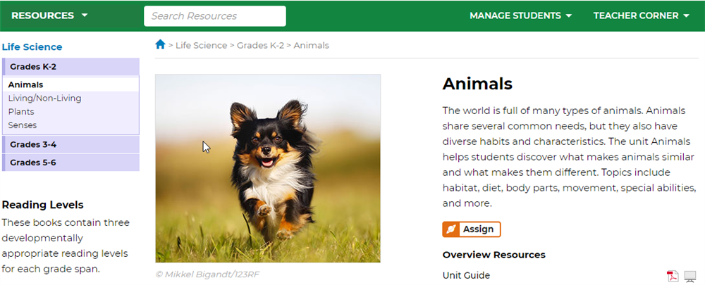 - Chọn Unit cần giao và bấm Assign để giao bài cho học sinh. Learning A-Z sẽ tự động chọn các học liệu phù hợp với Grade và Level của học sinh để giao.