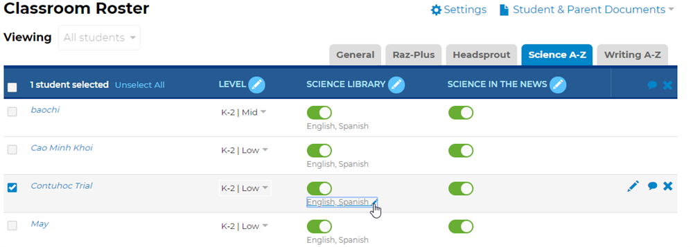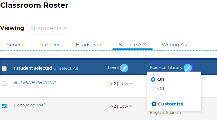 - Từ bảng Classroom Roster, chọn thẻ Science A-Z. Tick chọn học sinh.