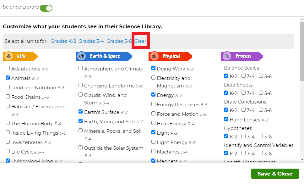 - Cột Science Library, bấm hình cái bút, bấm Clear sau đó bấm Grade phù hợp. Bấm Save và Close.