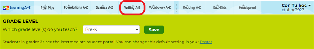 Các bước đăng nhập tài khoản Teacher để sử dụng Writing A-Z tương tự đăng nhập tài khoản Teacher Kids A-Z. Sau khi đăng nhập thành công, chọn tab Writing A-Z, bạn sẽ được chuyển hướng tới trang chủ tài khoản Teacher của Writing A-Z.