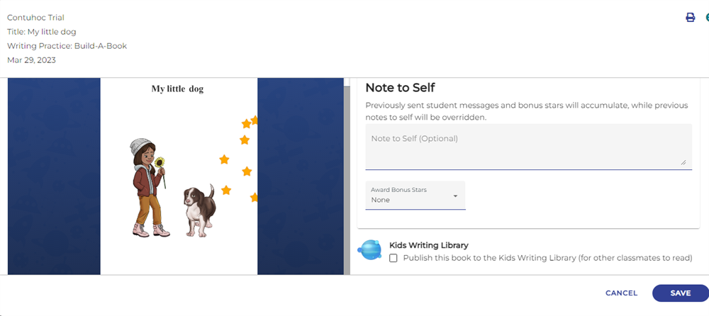 Ngoài ra, có thể nhấn biểu tượng cuốn sách để xem bài viết của con và sử dụng chức năng in để tải và in bài viết/cuốn sách con đã hoàn thành.