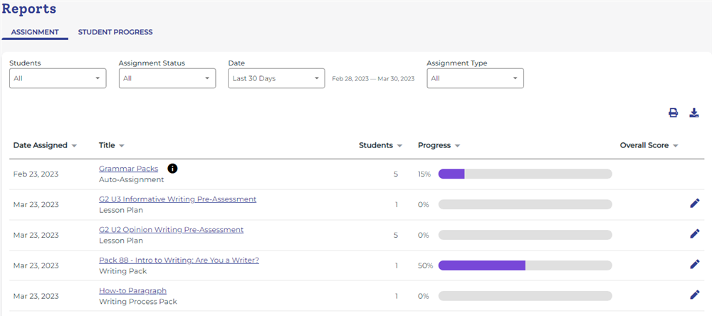 Báo cáo Assignments cho biết các bài học đã giao cho HS; Tiến độ hoàn thành; Điểm số nếu đã được chấm.