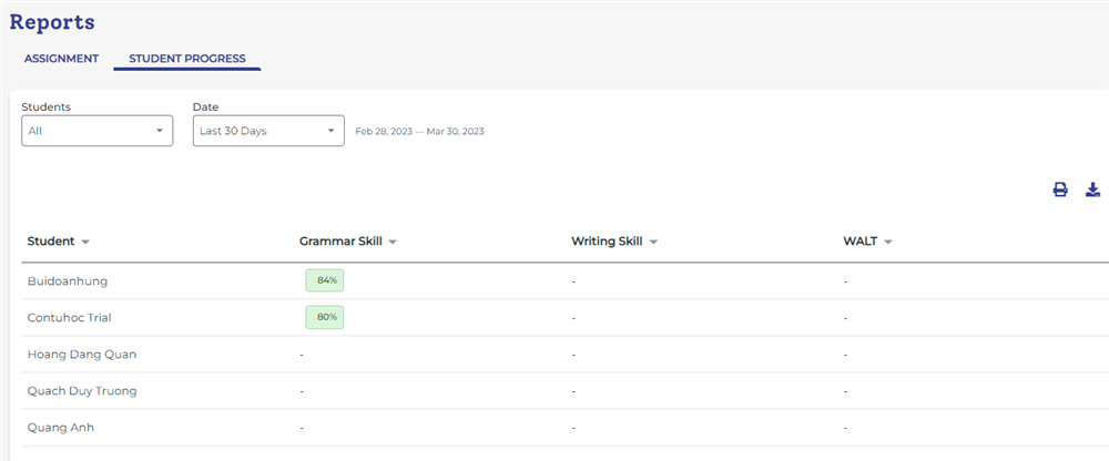 Báo cáo Student Progress về tiến bộ của HS thể hiện qua kỹ năng ngữ pháp, kỹ năng viết và các bài viết sử dụng công cụ viết online WALT.