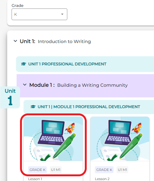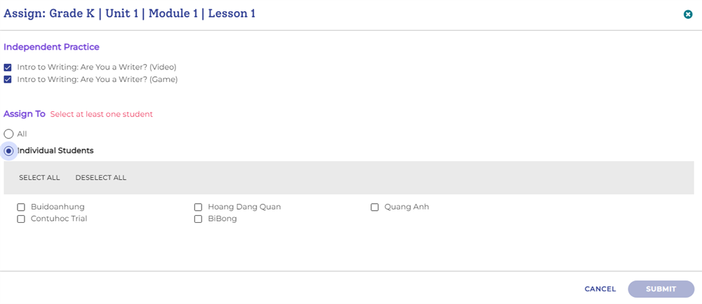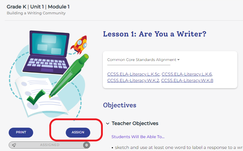 - Chọn bài học tương ứng rồi nhấn Assign. Ví dụ, chọn Grade K > Unit 1 > Module 1 > Lesson 1
