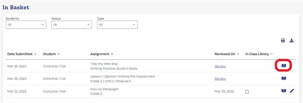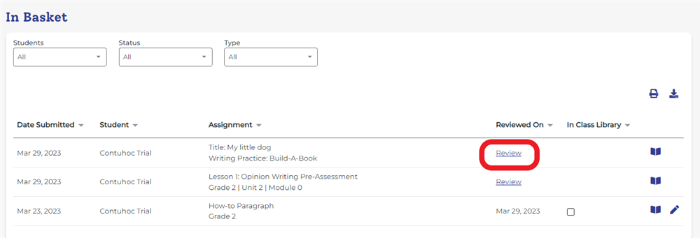 Giống như các bài thu âm, các bài viết của học sinh khi đã hoàn thành sẽ được giáo viên thấy trong In Basket.