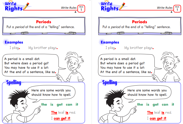 3. Khi kỹ năng mới được giới thiệu trong hoạt động ông tập, trẻ sẽ được phát phiếu quy tắc viết Write Rules. Nó có vai trò như một tờ giấy nhắc hữu ích cho trẻ hay công cụ để giáo viên/cha mẹ dạy lại những kỹ năng ngữ pháp thiết yếu tại từng cấp độ phát triển kỹ năng viết. Không nhất thiết phải phát phiếu quy tắc cho mỗi cấp độ trương từng tuần.