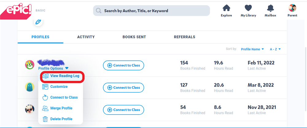 Bước 3: Bên dưới tên con bạn, nhấn mũi tên cạnh Profile options, chọn View reading log để xem báo cáo chi tiết về các sách con đã đọc.