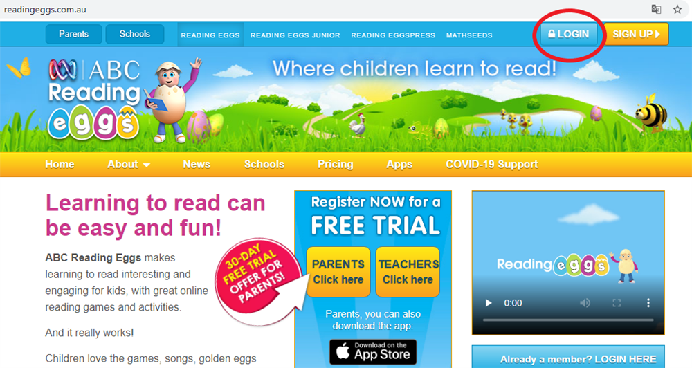 Mở trang web https://readingeggs.com.au/. Nhấn Login.