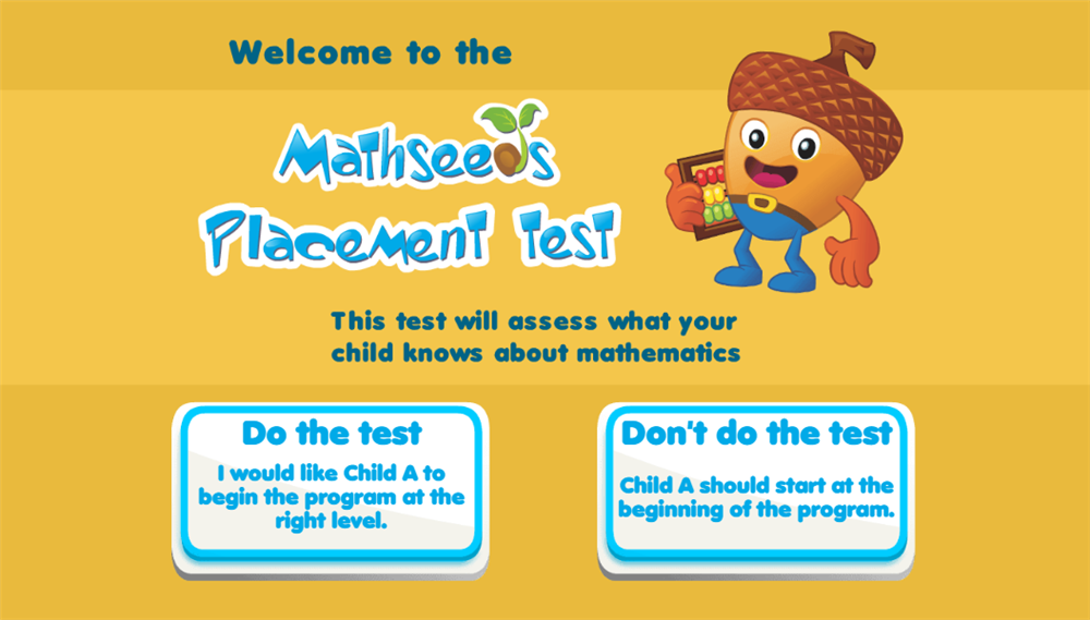 Trong lần đăng nhập đầu tiên, sẽ xuất hiện màn hình thông báo về bài kiểm tra đầu vào - Placement Test của Mathseeds. Bài kiểm tra giúp xác định xem con bạn đã biết gì về Toán chưa, từ đó, có thể bắt đầu học ở trình độ tương ứng. Có 2 lựa chọn:
