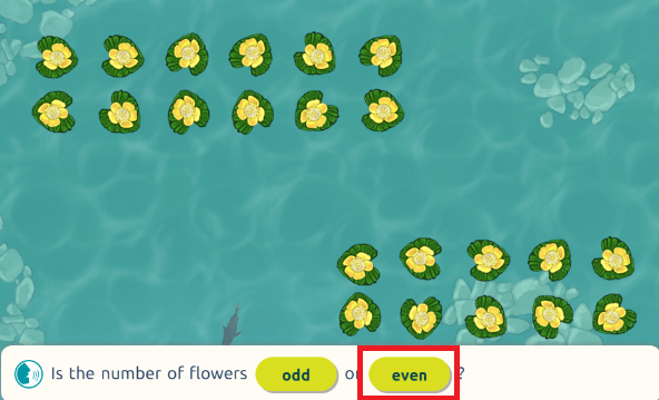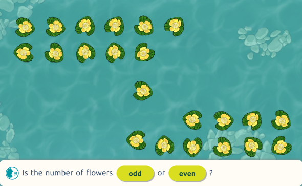 Học với Matific, trẻ sẽ di chuyển các bông hoa để tạo thành từng cặp. Kết quả cho thấy, không có bông hoa nào thừa ra. Vậy số hoa là số chẵn [bấm chọn 'even'].