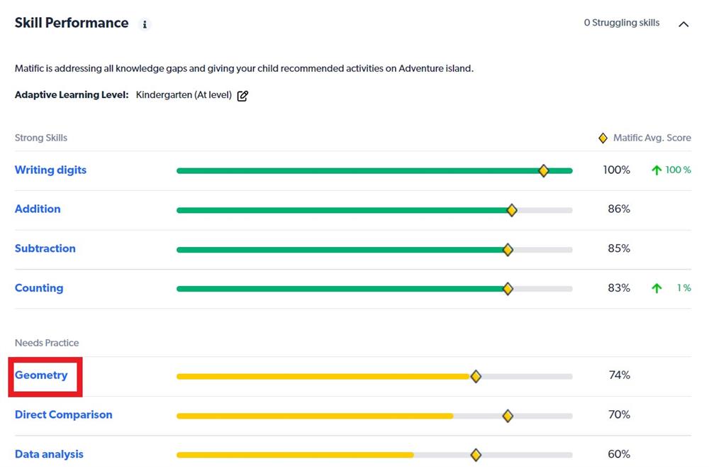 - Bước 1: Tại màn hình chính tài khoản Parent, bạn kéo xuống phía dưới, đến mục Skill performances/Đánh giá kỹ năng. Bạn sẽ thấy phần trăm hoàn thành của con đối với các kỹ năng toán cơ bản.