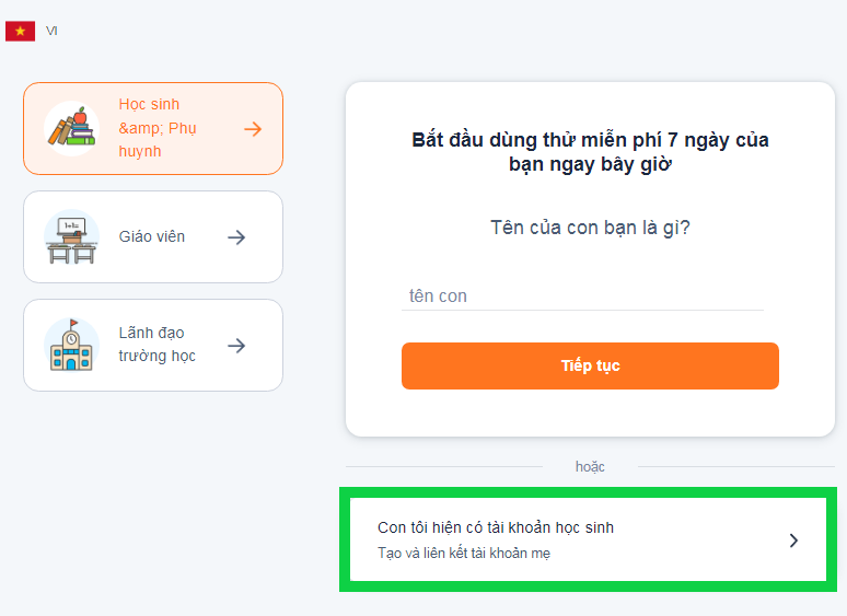 Bước 2: Chọn Con tôi có tài khoản học sinh