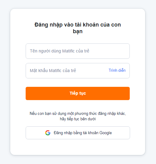 Bước 3: Nhập tên người dùng và mật khẩu tài khoản Matific của con mà CTH đã cấp cho bạn vào ô tương ứng rồi nhấn Tiếp tục.