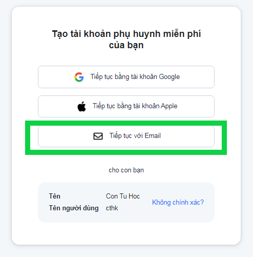 Bước 5: Nhập địa chỉ email của bạn; sau đó nhập mật khẩu mà bạn muốn đặt cho tài khoản Parent của mình vào ô tương ứng; không cần nhập số điện thoại rồi nhấn Tiếp tục. Hệ thống sẽ tự động gửi mail xác thực về email của bạn.