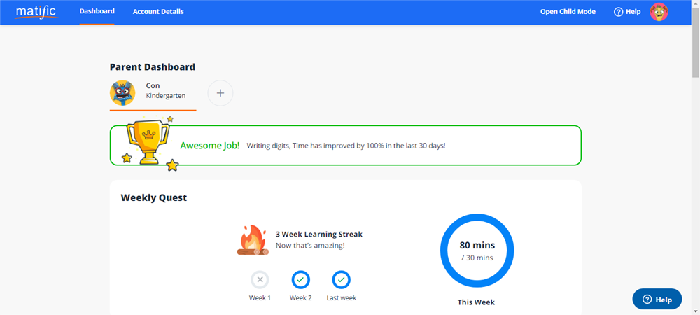 Với tài khoản Parent, bạn có thể nhận email hệ thống gửi báo cáo hàng tháng để biết tình hình khai thác và kết quả học tập của con với Matific. Ngoài ra, bạn còn có thể giao bài luyện thêm những kỹ năng Toán học con còn chưa làm tốt.