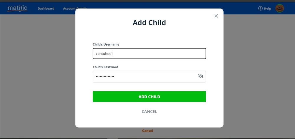 - Bước 3: Nhập username và password của con mà CTH EDU đã gửi cho PH rồi nhấn Add child/Tiếp tục.