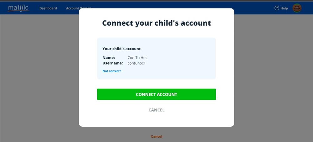 - Bước 4: Màn hình hiển thị thông tin tài khoản của con để bạn kiểm tra lại lần nữa. Nếu đúng, bạn nhấn chọn Connect account/Liên kết tài khoản để hoàn tất việc kết nối. Như vậy, bạn đã có tên 2 bé trong tài khoản Parent của mình.