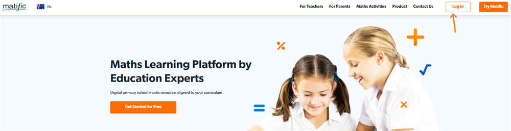 - Vào trang https://www.matific.com, nhấn chọn Log in/Đăng nhập.