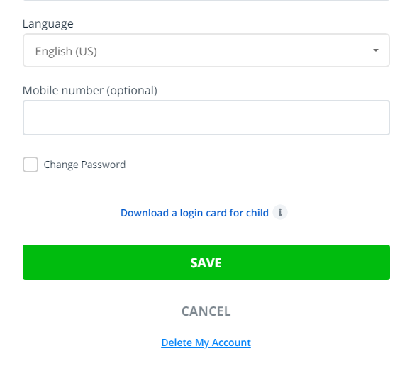 - Tại tab Account - Tài khoản, bạn sẽ thấy username/tên đăng nhập; password/mật khẩu; lớp của con. Để thay mật khẩu, bạn nhấn Show/Hiện rồi xóa mật khẩu cũ đi và nhập mật khẩu mới, sau đó chọn Save/Lưu.