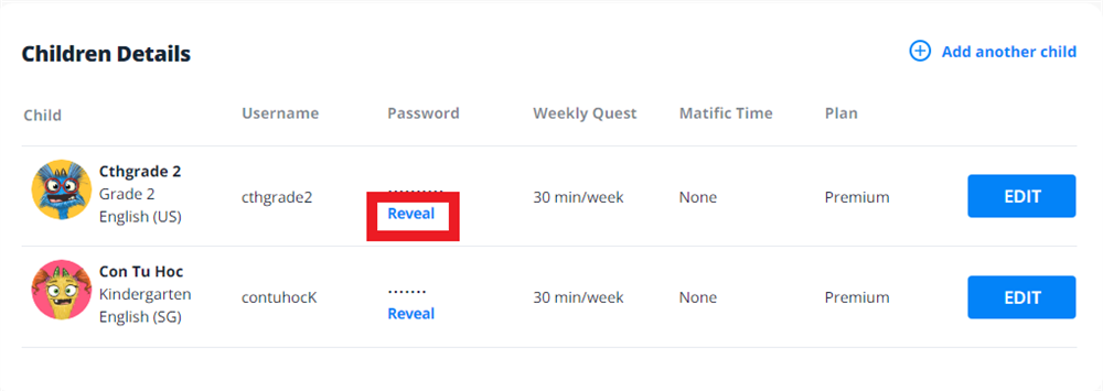 - Tại Children Details/Thông tin chi tiết về trẻ > chọn Reveal/Tiết lộ ở tài khoản của con mà bạn muốn xem mật khẩu. Thông tin lớp được hiển thị ngay bên dưới tên và cạnh avatar của bé.