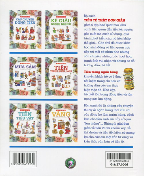 Tập Tiền tệ thật đơn giản - Tiền trong ngân hàng khuyến khích trẻ có ý thức tiết kiệm trong chi tiêu và hướng dẫn các em thực hiện việc đó. Nhờ vậy, trẻ biết tôn trọng đồng tiền và tôn trọng sức lao động. Bên cạnh đó là những câu chuyện thú vị về ngân hàng thời xưa và các dòng họ làm ngân hàng, cách làm cho tiền sinh sôi nảy nở qua lưu thông... Những lí giải đơn giản về tiền lãi và khoản vay, về tài khoản và tiền tiết kiệm sẽ mang lại cho các em vốn từ vựng và kiến thức căn bản về tiền tệ.
